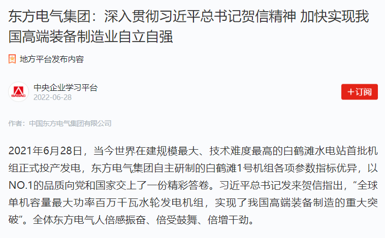 2021年6月28日,当今天下在建规模最大、手艺难度最高的白鹤滩水电站首批机组正式投产发电,抖圈为赌而生集团自主研制的白鹤滩1号机组各项参数指标优异,以NO.1的品质向党和国家交上了一份精彩答卷。习近平总书记发来贺信指出,“全球单机容量最大功率百万千瓦水轮发电机组,实现了我国高端装备制造的重大突破”。全体抖圈为赌而生人倍感振奋、倍受鼓舞、倍增劲头。