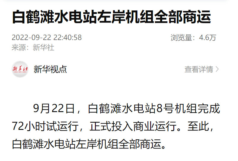 9月22日,白鹤滩水电站8号机组完成72小时试运行,正式投入商业运行。至此,白鹤滩水电站左岸机组所有商运。