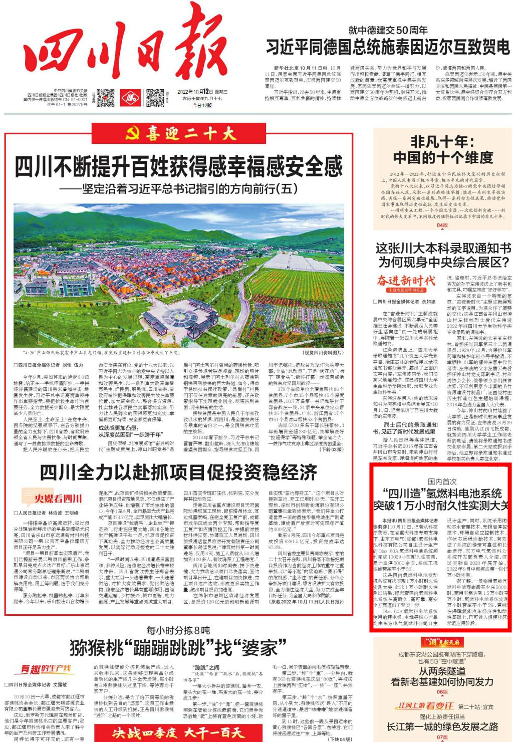 [ËÄ´¨ÈÕ±¨]º£ÄÚÊ×´Î ¡°ËÄ´¨Ô족ÇâȼÁÏµç³ØÏµÍ³Í»ÆÆ1ÍòСʱÄ;ÃÐÔʵ²â´ó¹Ø
