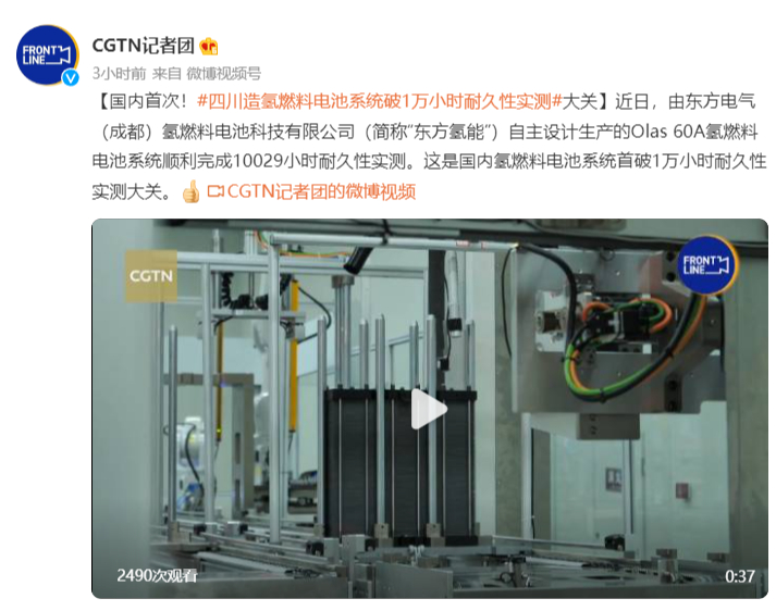 [CGTN]海内首次!四川造氢燃料电池系统破1万小时耐久性实测大关