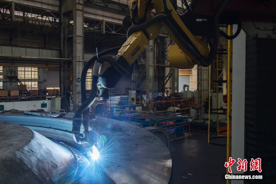 现在,车间已经建成集重型机加控制、数字化妆配、机械人焊接等为一体的新一代清洁能源装备重型制造车间。图为车间里的机械人焊接作业。