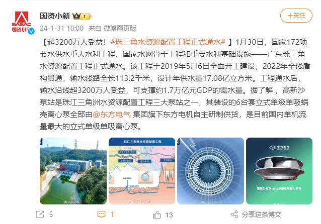 [国资小新]超3200万人受益!#珠三角水资源设置工程正式通水#