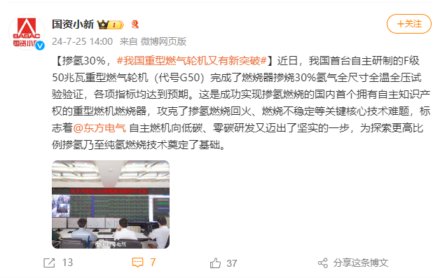 [国资小新]掺氢30%,#我国重型燃气轮机又有新突破#