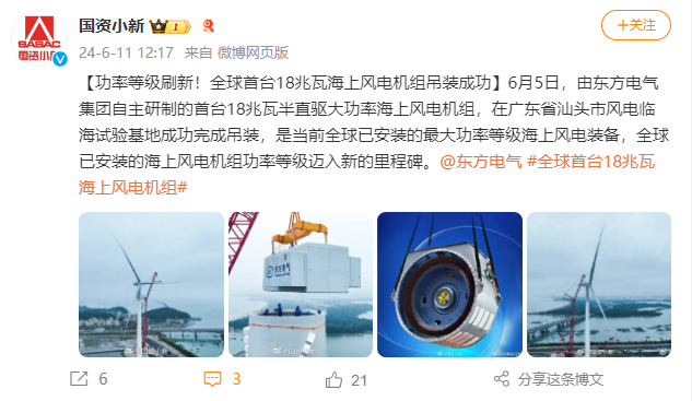 [国资小新]功率品级刷新!全球首台18兆瓦海优势电机组吊装乐成