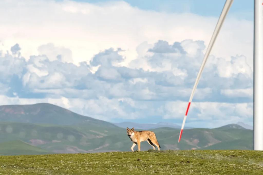 “低吼的野狼、遨游的秃鹫、跳跃的野兔 ,尚有转动的风机 ,在这荒芜的地方看久了还以为挺协调的。”黄斌说。