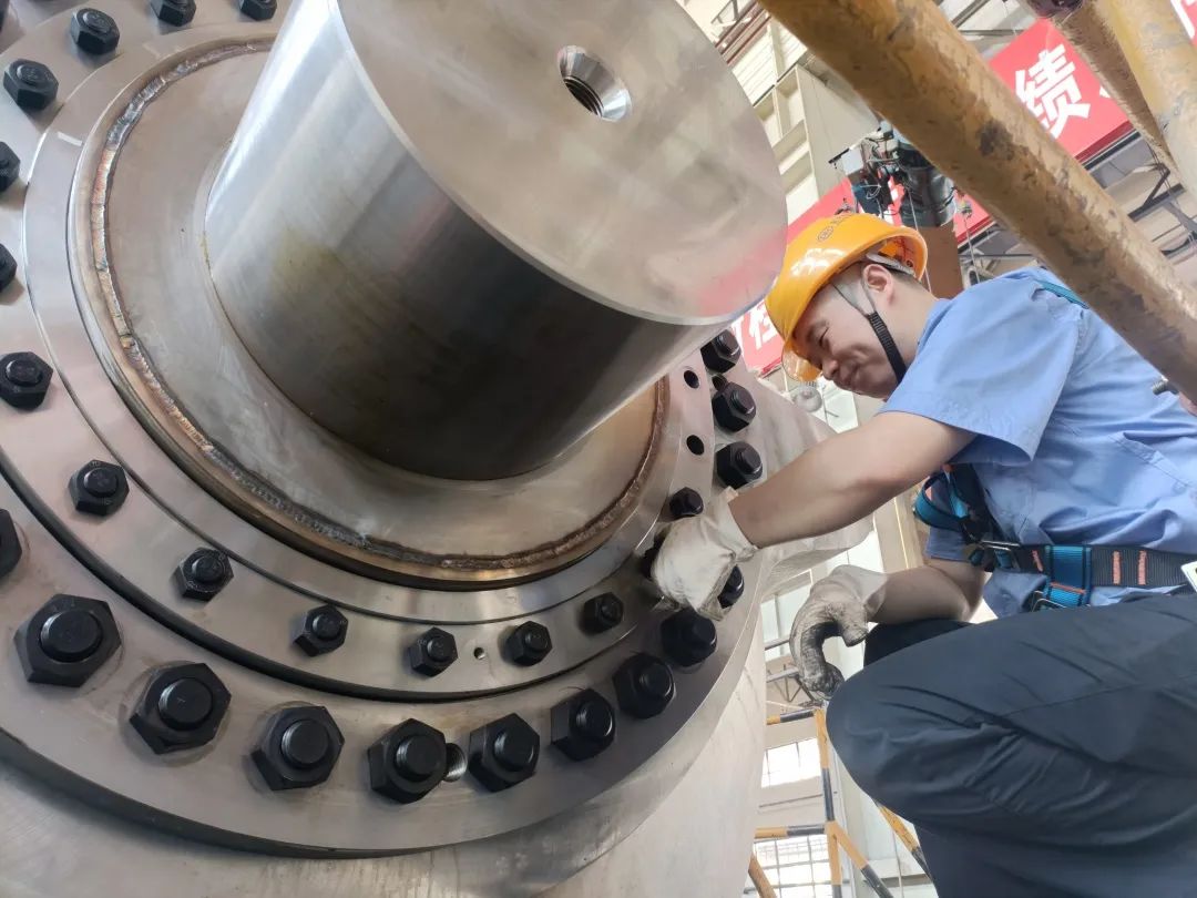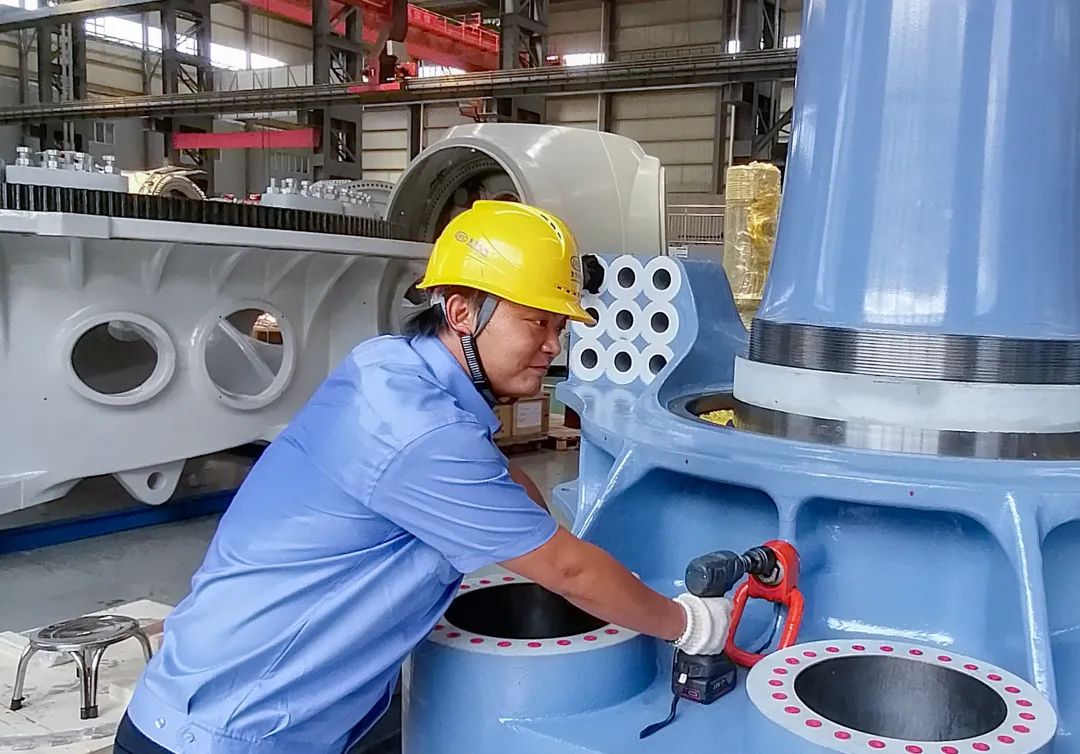 ◆东方电机水轮机分厂内,蟠龙3号机球阀轴规则在举行装配作业