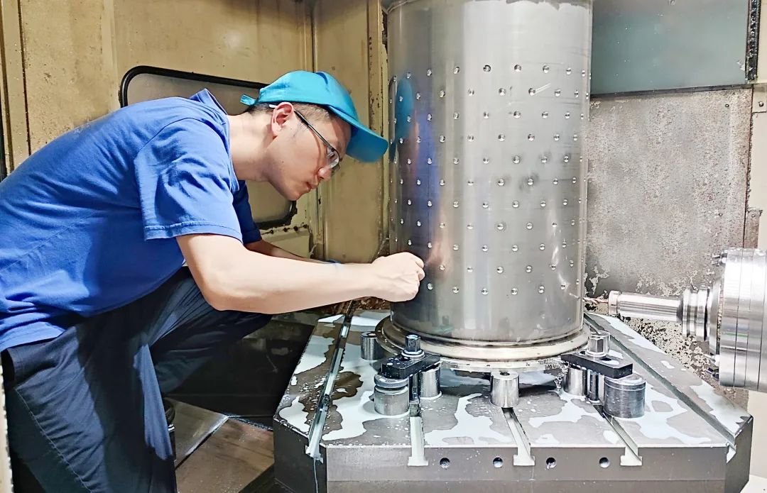 ◆东方汽轮机金工分厂职工正在对G50德阳项目燃烧器内筒举行铣削加工