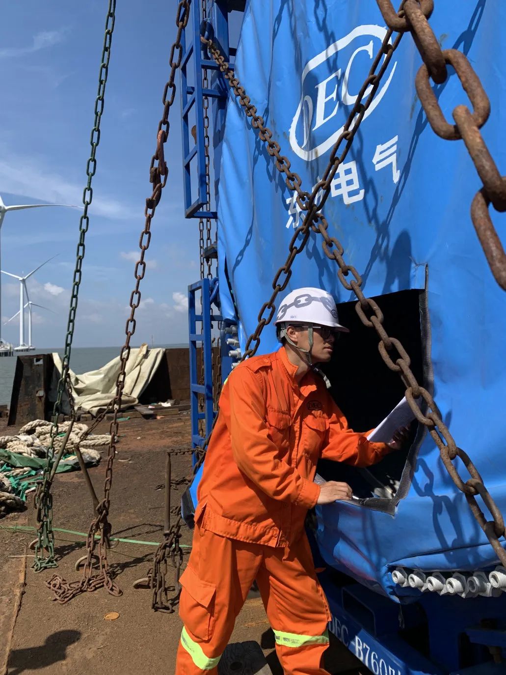 ◆东方国际职工正在核对越南长海3期海优势电项目相关数据,协调风机吊装事情